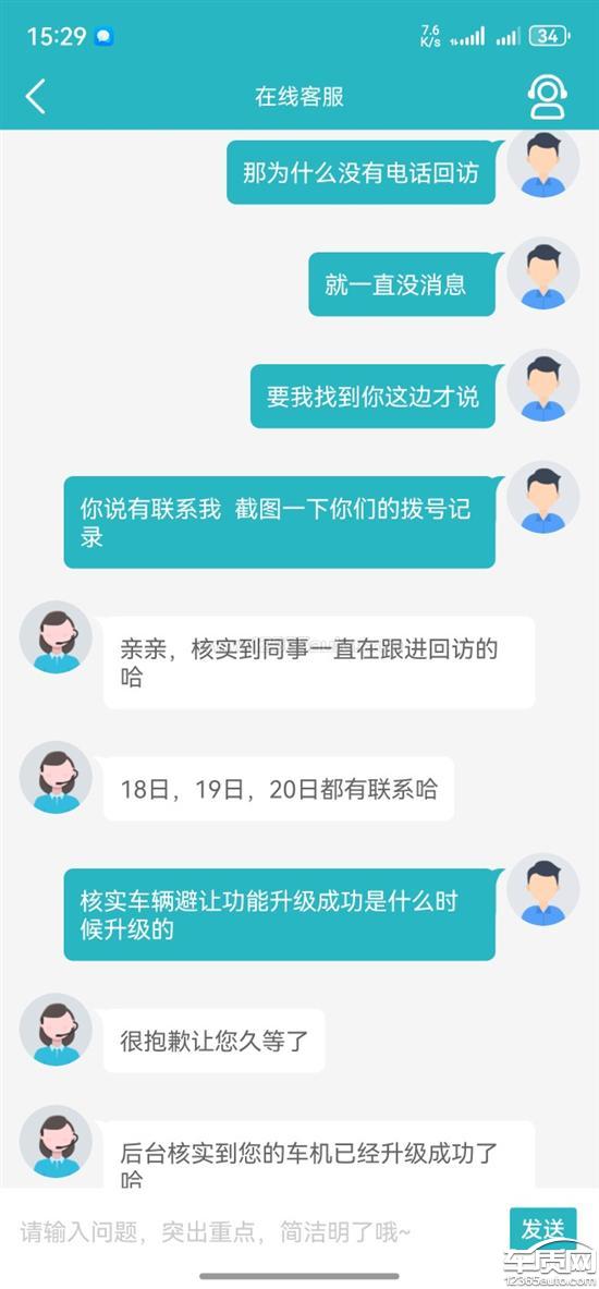 1、奇瑞APP私自取消实时更新车辆状态信息(猜测是为了节省服务器成本,把服务器压力给新车型使用了) 2、车辆避让功能从买车第一次OTA之后就没有这功能了,但是车机上显示已开启,实际道路上没有任何作用。 3、上面这些问题反馈给奇瑞官方客服,后续结果没有反馈,找到他们就说18-19-20号连续三天都有联系我,可是我的通话记录根本就没有他们官方打过来的通话记录。 4、已经进店检查过车辆,车辆没有任何问题。