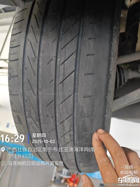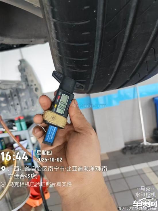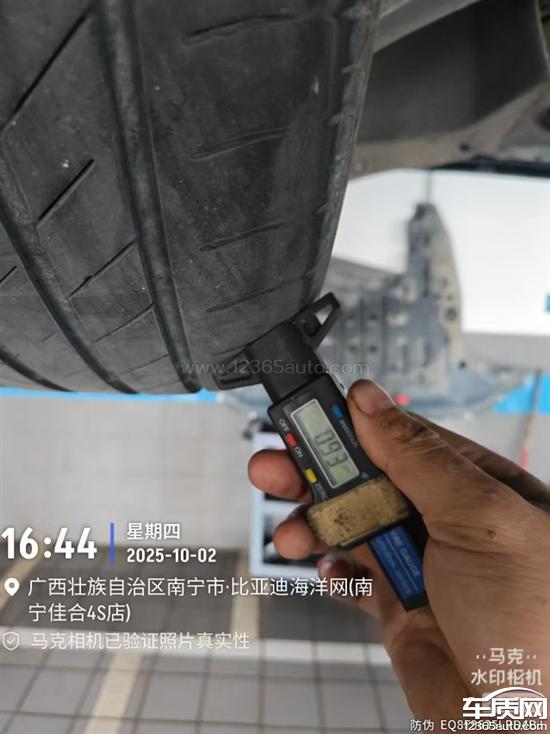 我每个季度都去进店保养,但保养人员没有按规定拿轮胎深度测量尺进行轮胎花纹测量,导致发生了严重吃胎情况,我不知道,直至10月2日再次保养,发现轮胎吃胎漏钢丝绳了。这么简单的轮胎吃胎都没有检查到位,你们的专业性在哪?有没有把每一项都按照比亚迪的规定检查到位?比亚迪是否给这些师傅培训到位?还是说,我们比亚迪车主去4S店保养就相当于走个过场。