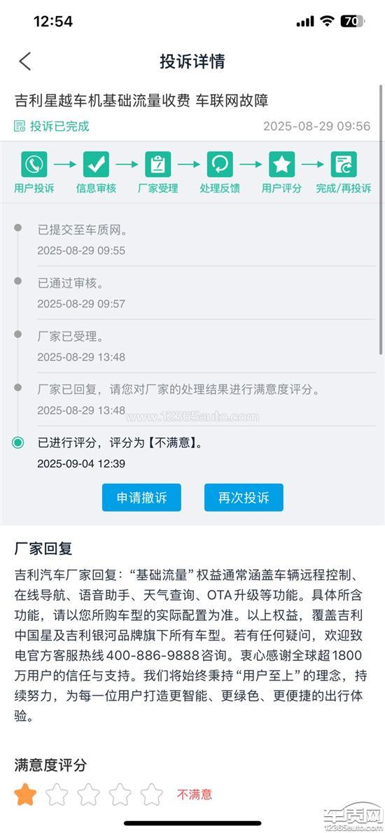 上次投诉后厂家回复“基础流量”权益通常涵盖车辆远程控制、在线导航、语音助手、天气查询、OTA升级等功能,但到目前为止,远程控车和sos紧急呼叫仍无法使用。