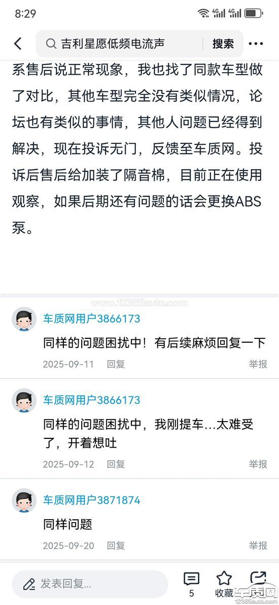 提车到现在一个多月,问题也没处理好。启动车辆踩刹车后一直有刺耳低频电流声传到驾驶位置,严重影响驾驶安全,每次驾驶后耳朵会耳鸣,头疼,诉求厂家快速联系解决。更换6月前出厂的刹车助力泵,加隔音棉止震板,达到静音效果。