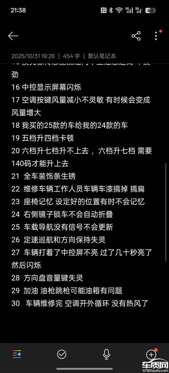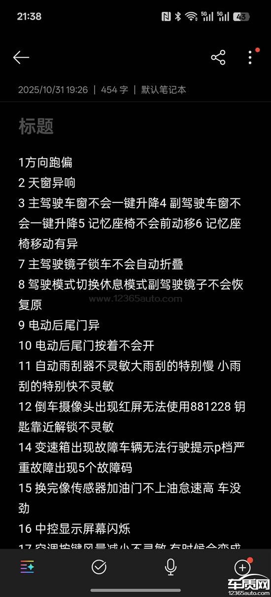 这辆车存在多个问题:首先,方向跑偏,天窗有异响,主驾驶和副驾驶车窗都无法实现一键升降;记忆座椅无法移动,并且在移动时有异响,主驾驶的镜子在锁车时不会自动折叠,驾驶模式切换到休息模式后,副驾驶的镜子也不会恢复原位。此外,电动后尾门异常,按下后无法开启;自动雨刮器不灵敏,大雨时刮得特别慢,小雨时反而特别快;倒车摄像头出现红屏,无法正常使用;钥匙靠近时解锁不灵敏。变速箱也出现问题,车辆无法行驶,提示P挡严重故障,并出现了5个故障码;更换了像传感器后,加油门不上油,怠速高,车辆动力不足;中控显示屏还会闪烁。更令人困扰的是,我买的是25款的车,但实际交付的是24款的车。最后,五挡降四挡时有卡顿现象,六挡升七挡升不上去,只有车速达到140码时才能升挡。