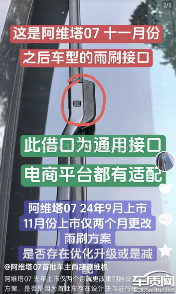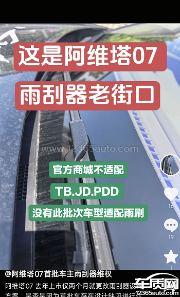 产品设计缺陷、公平交易权受损:因接口特殊,市面上第三方车雨刮器均无法适配,我被迫只能选择在4S店更换车雨刮器,胶条+工时费高达300元/次;而24年11月份之后生产的车主,可自由选择几十元的第三方雨刮,自己动手就能更换,这种“区别对待”让我承受了额外经济成本及不便。且雨刮器拆装难度大,从购买到安装全流程被强行绑定在官方售后,完全失去自主选择维修方案的权利。违反行业标准:依据行业标准T/ZZB0280-2017,雨刮器应具备“拆装方便、零件互换后无异常”特性,但25年11月份之前生产的阿维塔07雨刮器接口明显不满足该要求,产品设计与服务存在严重缺陷。诉求恳请市场监管局处理,要求阿维塔为我车辆更换通用接口雨刮总成,消除配件适配歧视,并承诺后续维修、配件供应的公平性;就未履行告知义务、设计缺陷问题进行公开说明并改进,保障消费者合法权益。