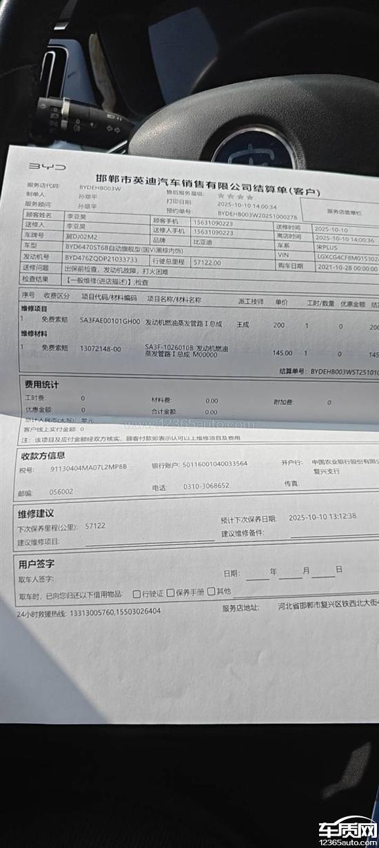 比亚迪厂家回复:感谢您购买比亚迪汽车,我们已将您所反映的问题反馈至相关部门,请耐心等待,同时请保持手机及其它设备畅通,方便工作人员与您联系,祝您生活愉快。