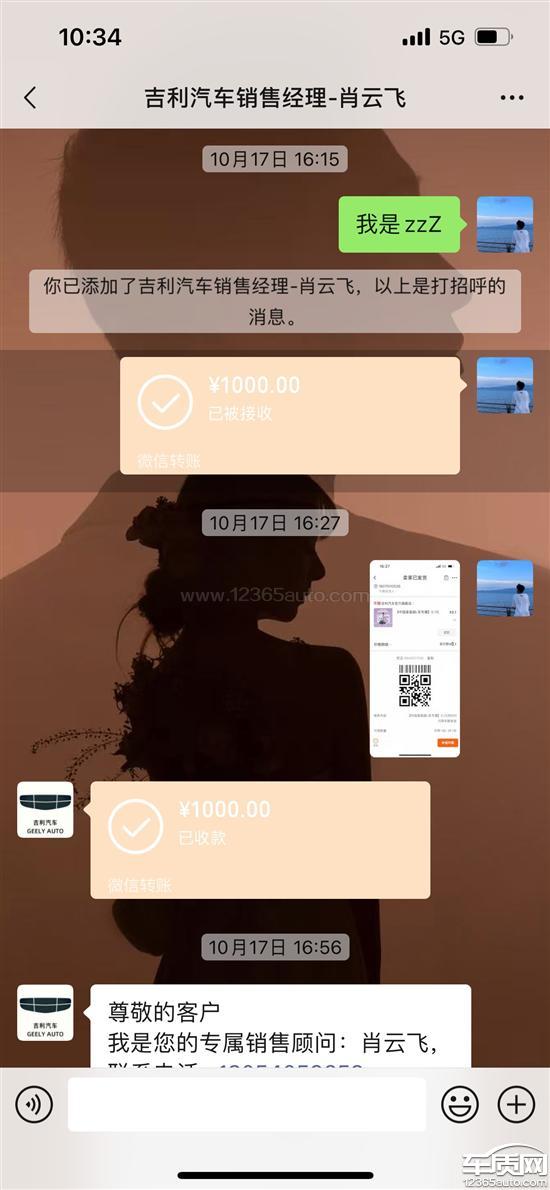 在长沙吉利4S店交了1000块钱意向金,现在不在哪里买车了,销售人员自己收了,要求处理。