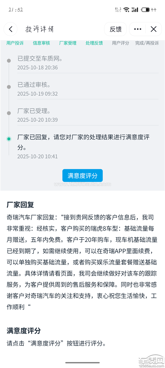 奇瑞汽车厂家回复:接到贵网反馈的客户信息后,我司非常重视:经核实,客户购买的瑞虎8车型:基础流量每月赠送,五年内免费。客户于20年购车,现车机基础流量已经到期了,如需继续使用,可以在奇瑞APP里面续费,可以单独购买基础流量,或者购买娱乐流量套餐赠送基础流量。具体详情请看页面,我司会继续做好对该车的跟踪服务,为客户提供周到的售后服务和保障。同时也非常感谢客户对奇瑞汽车的关注和支持,衷心祝您生活愉快,工作顺利