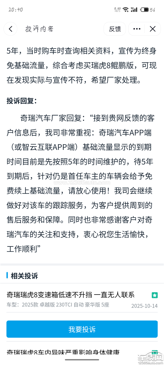 买的奇瑞汽车,当时承诺基础流量终身免费。五年了,现在却变成收费了。看他们给其他没到期的车主回复,还是说“终身免费”,显示五年后首任车主继续免费、做好服务;到期后就得交钱了?这也算不上欺骗消费者?投诉了几次厂家,4s店一个电话都没有,就是机器人统一回答,要钱,你们自己承诺呢,首任车主权益呢?