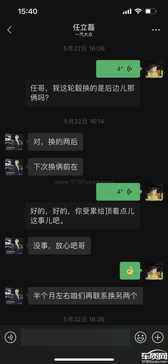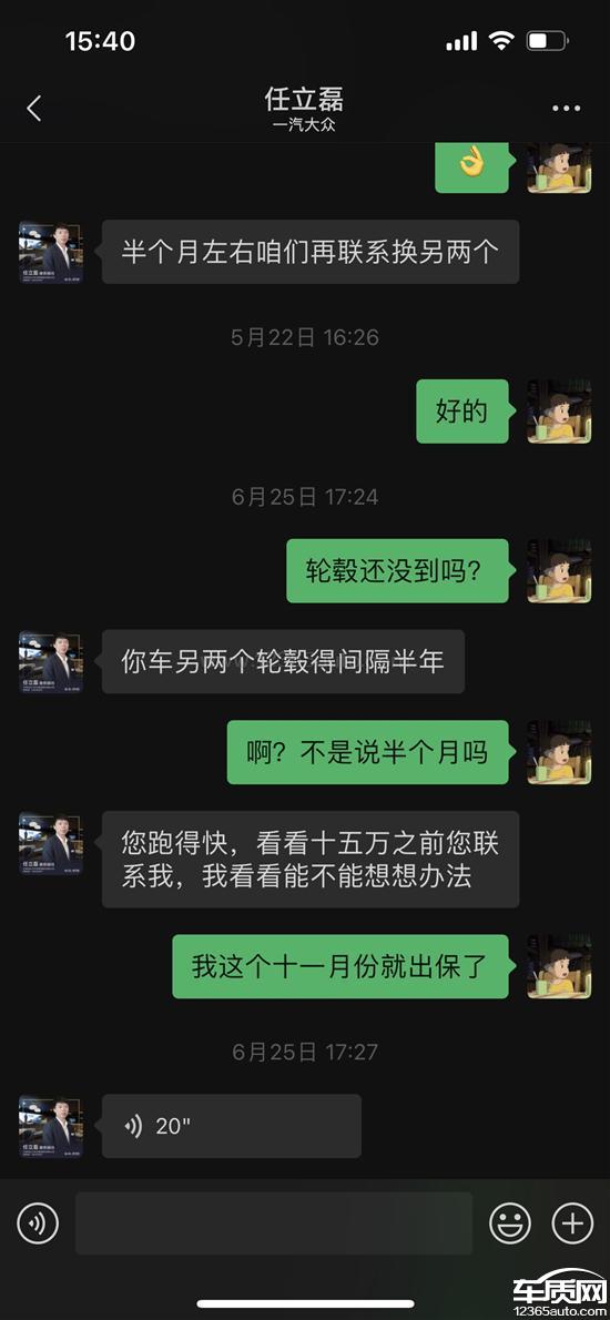 2025年5月22日前后在天津一汽大众4s店进行常规保养,工作人员告知我的车辆(大众探岳GTE)四个轮毂有锈蚀现象,影响行驶安全,需要更换,且当时我的汽车还在质保时间内,可以免费进行更换,过了一会又打电话说跟我汽车适配的轮毂没有货了,只能先更换两个,后面的需要等半个月以后,后期我等了一个月也没有工作人员跟我联系更换,与2025年6月25日又再次跟4s店工作人员取得联系,被告知因厂家政策变化,四条轮毂不能一起更换,剩余两个轮毂需要等6个月以后才能更换,当时我提出质疑,我的车在当时往后推6个月(2025年12月25日)已经属于出保状态,当时工作人员表示与公司索赔部沟通,到时候给我想办法更换,让我汽车跑到15万公里以前在跟他联系,2025年7月16日,当时的工作人员工作调动,由其他人接替他的工作,我当时提出轮毂问题如何解决和交接,表示他已经跟公司工作人员交接我汽车的问题,到时候会给我想办法更换。2025年11月27日,我与4S店工作人员联系更换轮毂,被告知汽车已出保,无法进行更换,我提及给我的承诺及聊天记录,但4s店工作人员告知我,请示了领导,领导不同意更换,且工作已经离职,当时他做的承诺不算数,不能为我提供更换服务,只能进行维修。