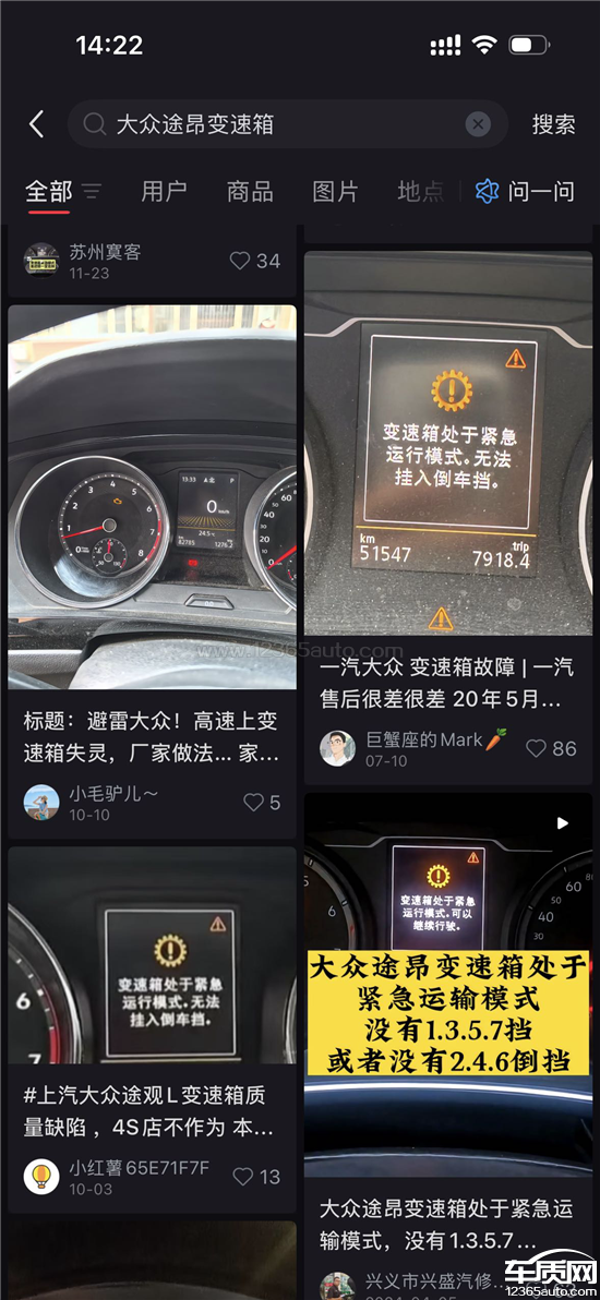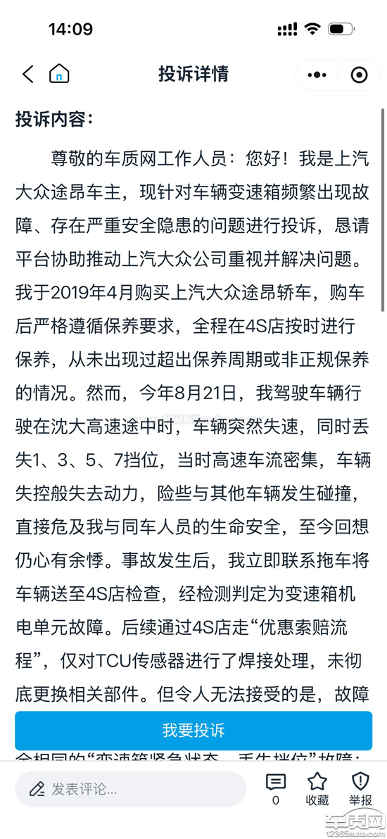 自2025年9月开始到11月中,在行驶和重启启动后共出现两次“变速箱处于紧急模式,无法挂入倒车挡”!经多方查询核实,此问题是大众变速箱本身的质量缺陷问题,属于通病!两次到4s店,经两次检修排查,说需要更换整个机电单元,工作人员超负责,多次和厂家沟通,递交了申请,说是可以免费更换,还让我交了1000的押金,但是要等半个月左右时间才能到货维修。隔了五天,忽然接到电话,说是厂家那边二次审核说我保养没在4s店,所以又给拒绝了!我想请问呢?变速箱属于大众汽车产品配件的质量缺陷问题,关我在哪保养什么事?如图:买了大众,多年一直在4s店保养的,变速箱不也出了问题?我的诉求是:免费更换维修本车变速箱所出现的问题,整个机电单元也好,其他部位也好,并且对其他车辆进行召回,免费检测维修此类质量缺陷问题的部件.