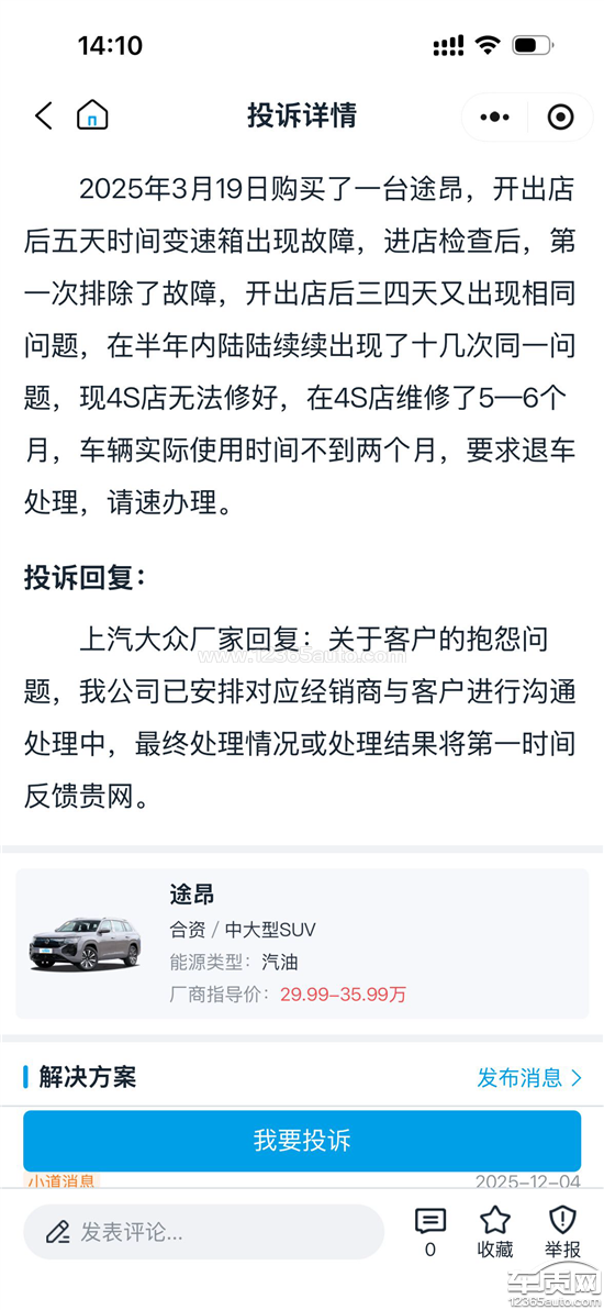 上汽大众厂家回复:关于客户的抱怨问题,我公司已安排对应经销商与客户进行沟通处理中,最终处理情况或处理结果将第一时间反馈贵网。