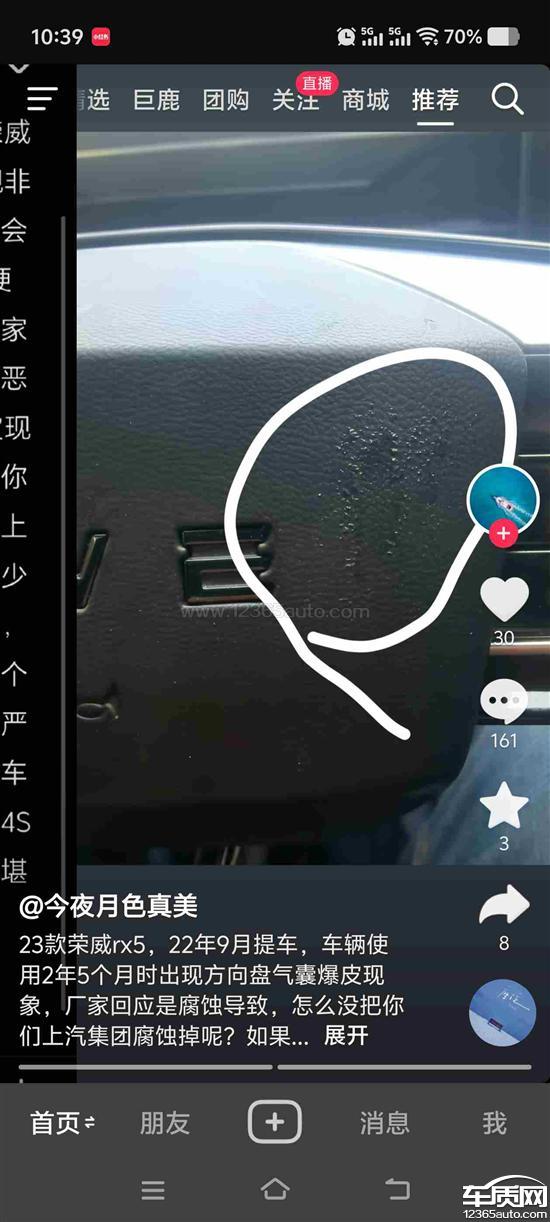 上汽荣威RX5方向盘脱皮 存在质量问题