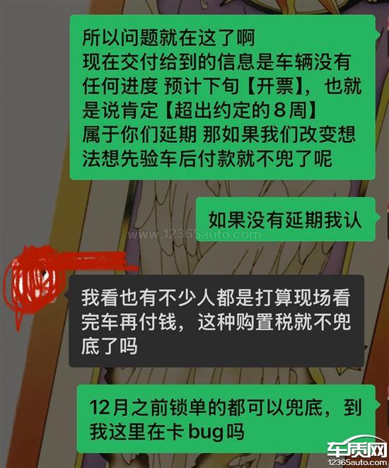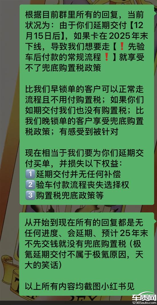 10.19日锁单,承诺交付时间为8周(12月15日前),当前依旧无任何进度,交付明确告知确定车辆将延期交付且极大可能在12月底下线,经过群内沟通明确以下情况:由于极氪延期交付,如果卡在2025年末下线,导致我想要走【先验车后付款的常规流程】就享受不了兜底购置税政策。与其他下定客户相比损失巨大权益:比我早锁单的客户可以正常走流程且不用付购置税;如果极氪如期交付我们也没有购置税;比我晚锁单的客户享受兜底购置税政策;有感受到被针对,且无解决方案。现在相当于我要为极氪未按承诺延期交付买单,并损失以下权益:1.延期交付并无任何补偿。2.验车付款流程丧失选择权。3.购置税兜底政策等。【交付群从开始到现在所有的回复都是无任何进度、会延期、预计25年末不先交钱就没有兜底购置税(极氪延期交付不属于极氪原因,天大的笑话)以上所有内容均有截图为证。】