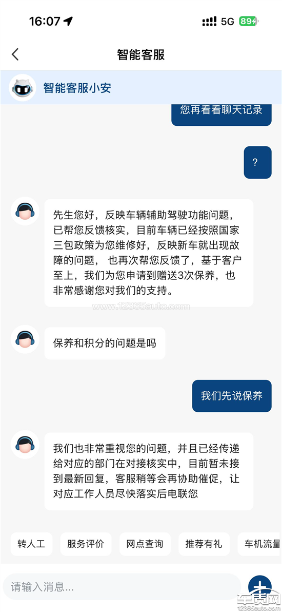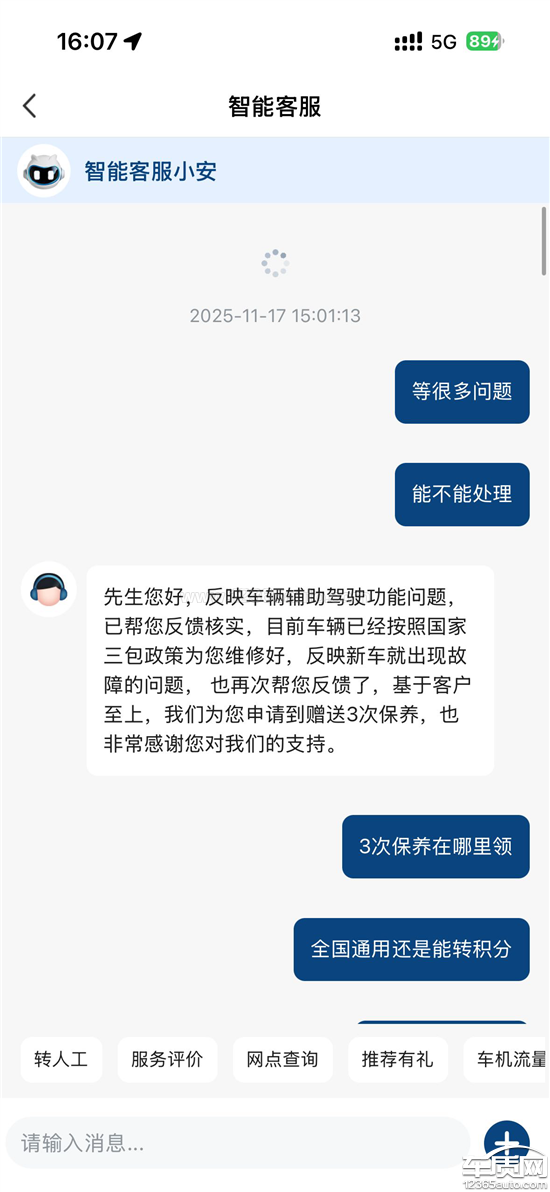 长安启源Q07新车驾驶辅助系统无法使用,续:新车出厂不到24小时就出现故障,4S店维修4天,最后通过刷新程序才解决问题。最开始4S店说拆车维修,给我1万元补偿,我不同意拆车。后来升级程序修好了车,我要求赔偿4天的交通损失以及新车延保,但4S店不答应。4S店一开始承诺的5次质保也不兑现,还两次电话威胁我撤销投诉,否则不会好好处理问题。之后厂家答应的3次保养也石沉大海,没有下文,我打电话催促,他们一直拖延,说24小时答复,结果20天过去了都没有答复。另外,新车激光版宣传说带小蓝灯,实际却没有,客服直接说没有小蓝灯这个东西;部分城区智能驾驶功能也没有,这属于虚假宣传。
