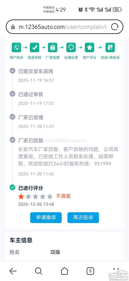 长安汽车厂家回复:客户反映的问题,公司高度重视,已安排工作人员联系沟通,如需帮助,欢迎您拨打24小时服务热线:951999