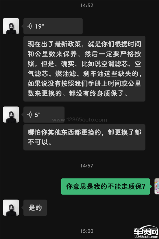 车辆在2025年10月左右做的保养,告知前氧传感器,干净端空气管,空气管橡胶管,发动机机脚垫需要更换,但是这些并不属于购车时说的13个易损件范围内,当时店里没货,现在联系店里帮忙订货,却被告知车辆没有质保,我全程保养都是在官方4S店完成,此前没有任何一次告知有什么政策更改,包括之前的保养中,如果涉及到空气滤芯或者空调滤芯需要更换,应该询问车主并告知车主不更换会产生的后果,历次保养过程中均无人告知也无人提及,现在车辆出现问题,需要走质保了,店里告知厂家有最新政策,此举可以视为厂家单方面更改也并未告知,明显的玩不起,割韭菜,要求正常走质保处理,本人承诺所有保养均为4S店处理。