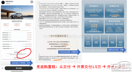 我于2025年10月29日在极氪APP支付5000元定金下定并锁单了极氪焕新7X汽车,锁单后APP显示8-10周交付。首先我投诉极氪公司的“兜底2026年购置税”虚假宣传、欺骗消费者。我发现在2025年10月28日焕新7X上市发布前后,“兜底2026年购置税”关键词是“交付”,车在2026年交付极氪就兜底购置税。在2025年10月24日之前,关键词变为“开票交付”,且只接受下生产线后立马交费、开票,否则不兜底购置税;对于交付,回避不谈。在今天2025年10月26日关键词已变为“开票”,直接把交付删除。买卖核心只谈开票,不管交付,难道消费者买车的核心仅仅是为了开票?对于这3个改变,极氪交付群各成员闭口不谈,只认可一条“消费者需要立马交费、开票,否则明年交费,购置税只能消费者自己承担。”明明是消费者给极氪兜底购置税,反而宣传极氪给消费者兜底购置税。对我而言,今天2026-12-26极氪微信交付群通知“车辆生产完成,等待从工厂发运。现在需要进行尾款支付。”但极氪APP仍是“锁定订单”状态,未进入到“生产运输”状态。两者信息不一致,不知道以哪个为准。因为购车协议中有“以本协议为准,取代口头声明、谈判、交流或声明”的极氪免责条款。根据行业交车流程,极氪将车运输到交付店--极氪发送交付通知--我收到通知后7个自然日内验车,支付尾款,完成购车流程。所以我在2026年1月5日左右(取决于极氪运输到交付店的快慢时间)支付尾款,是合法、合理、正当的权益。但极氪公司为了避税,剥夺消费者的合法验车权,损害消费者利益。2025-12-26极氪的交付人员明确告知“消费者需配合极氪在未验车,未知车辆是否满足交付要求的前提下,在25年底支付尾款。因为极氪需要在25年开具发票,否则需要交税,并由消费者承担2026年的购置税”。该种操作,极氪还违反购车协议:根据购车协议:极氪将在消费者支付尾款且完成车辆验收后交付车辆,故本人只要车辆到店后,在要求的时间内验收车辆并支付尾款即为履行协议,极氪在收到车辆尾款后履行开票交付义务。故而不存在因消费者个人原因导致极氪发票开具在26年的情况。该情况为极氪生产、交付车辆时间晚导致,非消费者原因。《消费者权益保护法》第八条、第二十三条,赋予消费者知情权与质量核验权;《民法典》第四百九十七条,明确限制消费者主要权利的格式条款无效;《民法典》第六百二十条、第六百二十三条,规定了买受人的“检验通知义务”。因此车辆交付前的验车权是消费者的法定权利,不能以“合同没写“或“购置税政策“被剥夺。综上所述,本人的诉求为:(1)极氪履行购车协议以及10月份发布的《购置税补贴方案公告》,在车辆到交付店后出具交付通知,本人在收到交付通知后7个工作日内验车,确认车辆符合交付条件后支付尾款。若极氪开票在2026年,产生购置税,极氪应提供购置税补贴,在订单尾款中扣除购置税。(2)根据《消费者权益保护法》第五十五条,极氪存在欺诈行为,下定时《购置税补贴方案公告》关键词为“交付”,下定后私自篡改为“开票”,符合“退一赔三”,应退还三倍定金,即15000元。