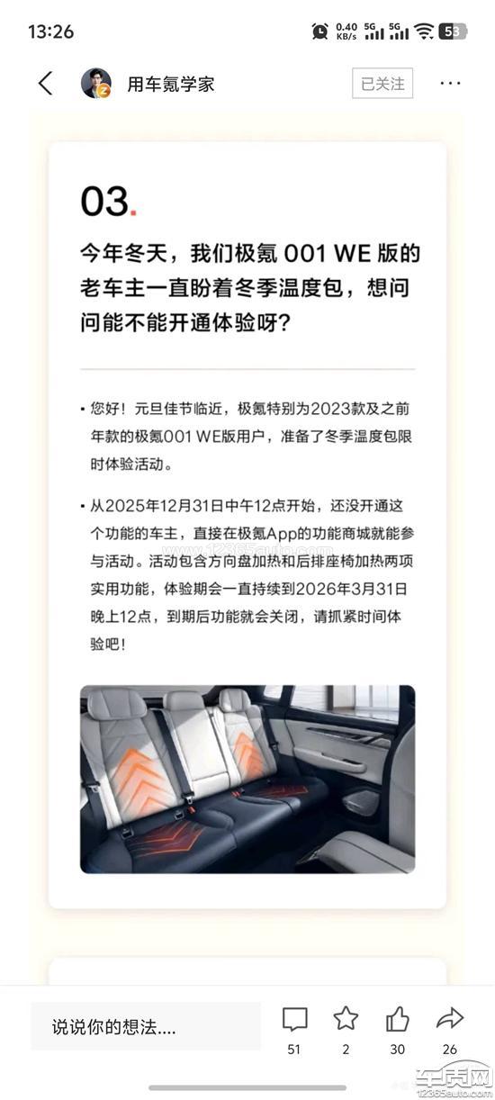 极氪厂家回复:相关问题已收到,感谢您对极氪的监督与支持!为了答谢老用户的支持,001WE版车型专属冬季温度包限时免费体验。现在是限时体验活动,并不是终身免费开通。体验期结束后,如需继续使用,还是需要付费开通的。