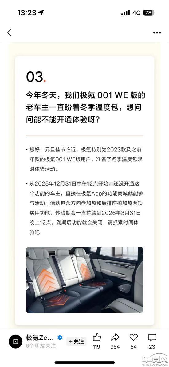 极氪于25年12月31号给21,22,23款未购买加热包的车主送限时加热包到26年3月31日。加热包本来就是天冷的时候用的,现在送到明年开春,刚刚好把最冷的周期度过了。以后要是每年都送,那我花2400买加热包有什么意义?我们老车主拿真金白银支持,车企拿我们当日本人整,我现在需要车企把送的加热包以等额价值积分补偿给我,如果以后车企还会送加热包,那要不全额退款,要不就每年积分补偿!
