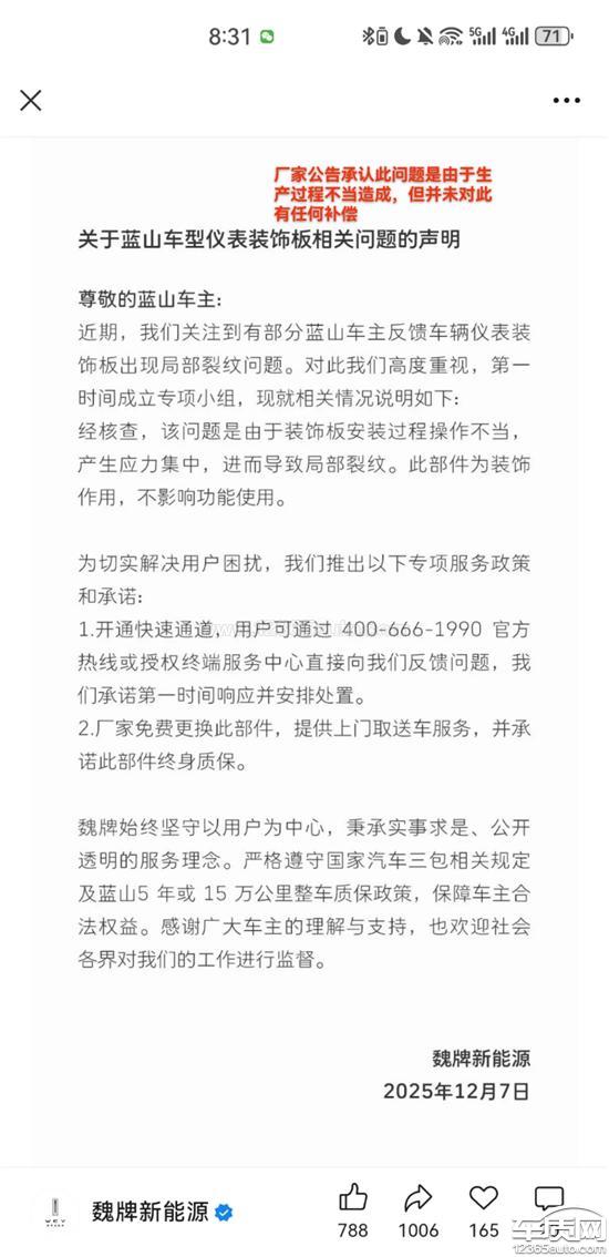 厂家已出公告承认这是批量质量问题,均为生产过程中失误导致,反馈问题至今未有任何赔偿方案,要求车主更换仪表台大件,却没给任何附件质保,车辆贬值与风险毫无责任担当。