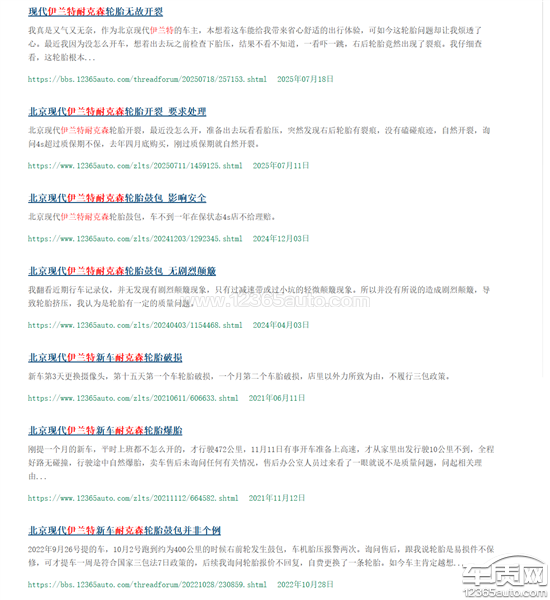 北京现代?伊兰特?2022款?1.5L?CVT?LUX尊贵版于2022年1月份购买,期间正常行质驶,近期发现原厂随车四条耐克森轮胎出现不网同程度的脱皮、掉皮、裂纹,严重影响行驶安全,上网查询发现伊兰特耐克森轮胎脱皮、掉皮、裂纹不是个案,希望厂家能召回。
