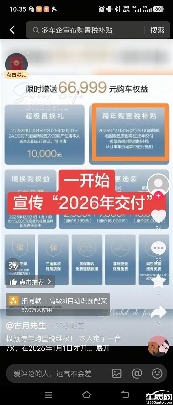 本人2025年10月30日订购极氪焕新版001ultra+车型,极氪承诺在10月31日前锁单因即可原因2026年交付将兜底购置税差额。后被强制于2025年12月31日在未验车的前提下强制要求交付尾款开票,如在2026年1月1日后付款,则不予兜底购置税。本人迫于无奈选择交付尾款。实际情况为车辆在26年1月5日到达极氪家,具备交付条件,因25年开票导致无法申领2026年报废车辆补贴,损失20000元,至今无补救方案,涉嫌违约和侵害消费者权益。既然官方承诺“因极氪原因导致2026年交车付”就兜底,那么12月31日下线导致的跨年,理应由极氪承担责任。本人诉求为赔偿因强制提前开票导致的2026年报废补贴损失20000元。