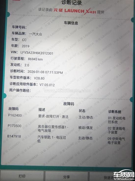 变速箱出现故障,二挡锁死,在高速路上失速,差点撞车,此时故障灯点亮,变速箱报试运行状态。到修理厂检查,发现是离合器传感器报故障。要求处理。