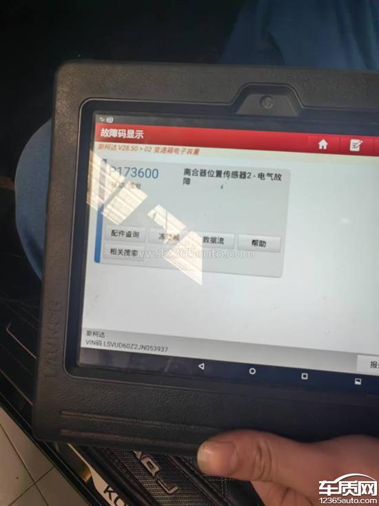 在收到相关提示后,我驾驶车辆下高架路并靠路边进行测试,发现挂入倒挡时车辆没有反应,挂入前进挡起步时车辆抖动无力,顿挫感十分明显。2026年1月13日下午,经检测,确定为离合器位置传感器2出现电气故障,故障代码为P173600 。