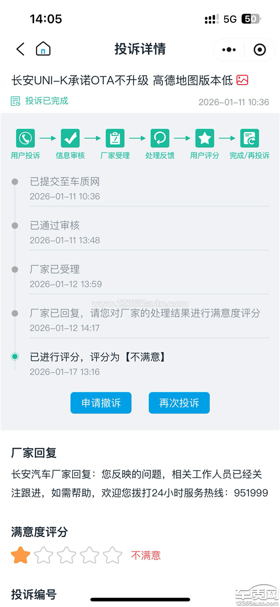 厂家敷衍不处理,投诉到处理完成投诉,投诉至今没有厂家和4s店人员联系我.这是长安汽车对消费者的态度?对车主的责任?22年4月份的车,承诺OTA终身免费升级,车机却一直没有得升级,高德地图版本低,消费者无法得到应有的权益,投诉了两次,厂家说有人会联系我,却一直没有,反而两次的投诉,都说无法达到一致,无法和解,新车型没有出,系统也没有得升级,消费者的权益得不到保障,对待车主也不一致,其他的车友都有得补偿。