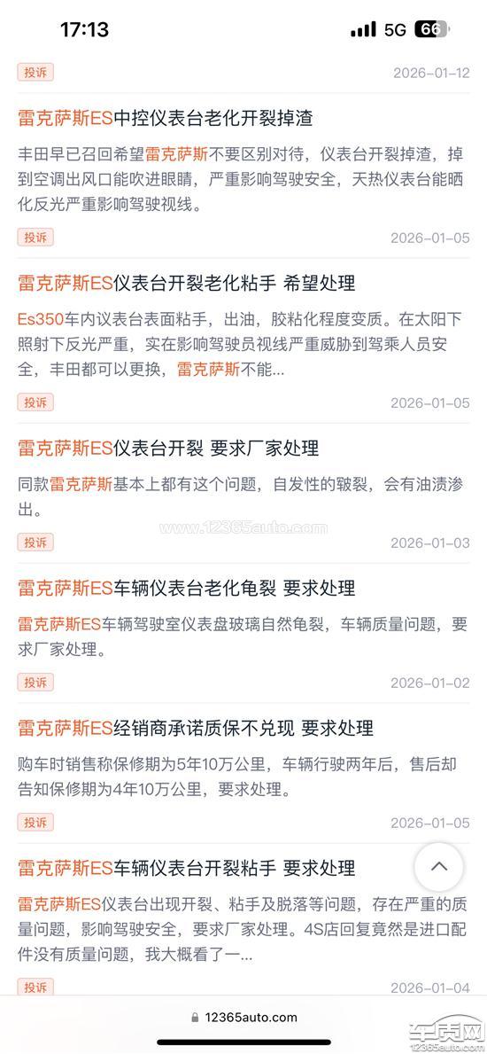 您好!经上一回投诉反馈,相关方称代表厂家回复如下:1.车辆非在其处购买,(如要查询购买信息须带相关证件到附近相关门店查询)2.车辆已过质保,(自购车日期起4年质保)3.雷克萨斯不属于丰田旗下高端品牌,综上条件不符合召回保修更换。对于厂家回复,本人非常不满意,甚至愤怒,放眼平台雷克萨斯es车系2006-2012款投诉内容,百分之九十都是仪表台老化开裂起胶问题,这就反映了此仪表台在设计或用料上存在缺陷,由于小型客车国家政策给予的使用年限系无报废期限,所以厂家应有责任,不应以各种理由或借口拒绝为客户提供免费更换服务。而同时期的丰田品牌部分车型也一样有仪表台老化开裂起胶问题,但是厂家给予了免费更换服务,所以雷克萨斯品牌同属丰田汽车公司旗下也应当一视同仁。