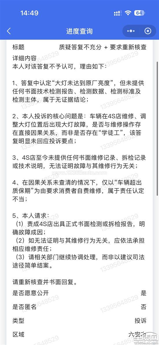 本人系一辆一汽大众CC2021款车辆的合法车主。本人因车辆大灯相关问题前往4S店进行检查。在未征得本人明确同意、亦未充分告知维修风险的情况下,4S店维修人员擅自对车辆大灯总成及安装缝隙进行调整操作。自该操作完成后,车辆随即出现以下异常问题:1.左侧大灯左右调节功能失效,调节螺丝无任何实际反应;2.大灯照射光型异常,启动车辆后光型发生明显变化;3.上述问题在4S店操作前从未出现,具有明显的时间先后关系及因果关联。问题发生后,本人多次联系涉事4S店及一汽大众官方400客服进行投诉。但截至目前,4S店拒绝正面处理,电话长期无人接听或推诿责任;厂家客服仅反复回复“已反馈”“已答复”,但从未有任何工作人员与本人取得联系,也未提供任何实质性解决方案。目前车质网平台显示“厂家已答复”,但该所谓“答复”仅停留在系统层面,并未履行任何解决义务,问题至今仍未得到处理,车辆故障依旧存在。本人认为:即便车辆已超过质保期,如故障系4S店不当维修或擅自操作直接或高度可能导致,4S店及厂家均应依法承担相应责任。目前厂家与4S店相互推诿、长期拖延,已严重侵害消费者合法权益。投诉诉求:1.要求明确认定涉事4S店维修操作是否存在不当;2.要求对车辆大灯问题进行全面检测并恢复正常功能,相关费用不应由消费者承担;3.要求厂家指定明确负责人直接联系本人并推进问题解决;4.要求停止以“已反馈”“已答复”等形式性回复敷衍消费者。针对六安市12345平台的回复,本人作如下说明:12345回复中仅转述4S店及厂家单方说法,未对维修前后车辆状态进行任何专业核查,也未就4S店擅自调整大灯结构的行为进行技术认定。本人投诉的核心问题并非“大灯自然老化亮度不足”,而是:车辆在4S店未经本人明确授权调整大灯后,立即出现左右调节失效、光型异常等问题,该问题在维修前从未存在。12345回复将“不当维修导致的功能异常”简单归因为“超质保亮度不足”,属于事实认定不清、逻辑混淆。同时,回复中提到“建议通过司法途径鉴定处理”,恰恰说明厂家及4S店无法否认维修行为与故障之间的因果关系,但拒绝主动承担检测及鉴定责任。截至目前:4S店拒绝维修厂家仅系统回复“已答复”,未实际解决问题车辆仍处于故障状态本人请求车质网督促厂家及4S店:1.正面回应维修操作是否存在不当;2.承担相应检测及修复责任;3.不得以“过保”为由回避因自身维修行为引发的故障问题。