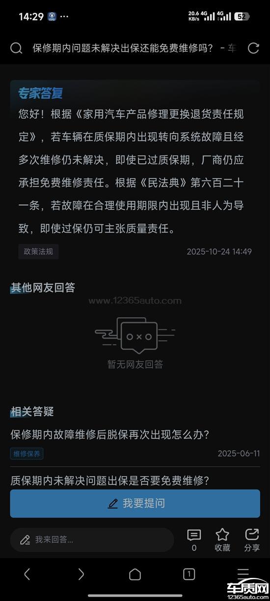 24年6月,我的车辆出现车机故障,当时车机莫名发烫,屏幕UI显示异常,甚至无法开机。当时检测车辆车机存在问题,但车辆随后恢复正常,未进行更换。25年9月28号,刚过保一个月,车辆再次出现车机问题且持续未好转,导致国庆期间开车无法使用任何车机相关系统,行驶途中险些发生事故,此后便很少用车。向相关方反馈问题后,对方相互推诿。车辆还存在屏幕无法熄灭的情况,每次开车需携带扳手,先打开机盖连接小电瓶电源再启动车辆,之后断开小电瓶电源后,机舱盖无法锁闭,车门也无法锁闭,任何人都能将车打开。10月,相关方让我前往某地检测,确定是车机问题后再反馈,我前往检测后确认确实是车机问题,对方却告知需自费维修,之后便将车辆放在库房,无人过问,也未将车辆开出。从25年9月反馈问题至26年1月,期间多次联系品牌客服,客服均表示会给予回应,但一周、两周过去后均无任何反馈。26年1月10号,我忍无可忍,只能通过车质网投诉。我查阅相关规定,汽车在质保期内出现的问题,过保后仍可享受免费维修,我持有相关聊天记录和维保记录。