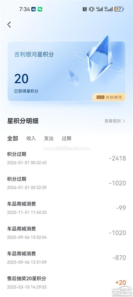 吉利汽车厂家回复:您好!非常抱歉,经核实,您于2024年度获得但未使用的星积分已于2025年12月31日到期。星积分的有效期为获取后至次年年底,逾期将自动失效,相关规则您可在吉利银河App中,通过【我的】-【星积分】-【查看规则】详细了解。在星积分到期前,我们已通过吉利银河App社区公告(如《2024年获取星积分即将清零公告》)及站内信(【我的】-【我的消息】-【系统消息】)进行了提醒。我们非常理解星积分是您珍贵的权益,对于过期也十分惋惜,但根据平台规则,已失效的星积分无法进行延期、恢复或补发。诚挚建议您日后多关注积分有效期,及时使用,以免再次造成损失。感谢您的理解与支持!