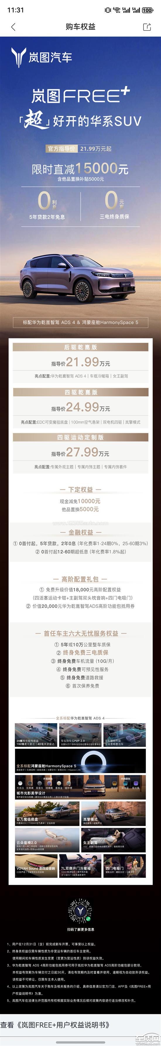 本人9月14日提车,在12月3日,该汽车品牌官方即宣布对该车型提供10000元的现金优惠。此时距离我提车仅仅过去2个月,车辆行驶里程仅3000余公里。此次降价是厂商统一的官方行为,并非经销商的个别促销活动。这导致刚完成购车的老车主,我的车辆瞬间贬值,蒙受了不小的经济损失。我认为该汽车品牌在短时间内大幅降价,且对近期购车的车主没有任何补偿或说明,这种做法及其不负责任,不仅损害了早期支持岚图品牌的车主的利益,也有损品牌信誉。况且同样的问题已经有不少车友在反馈了,因此我要求岚图汽车品牌厂家重视这一问题,给予近期购车的车主一个合理的解决方案,比如提供等价值的现金补偿、赠送多次免费保养、赠送同等价值的岚图商城积分等等,或者是提供其他形式的等价权益补偿。