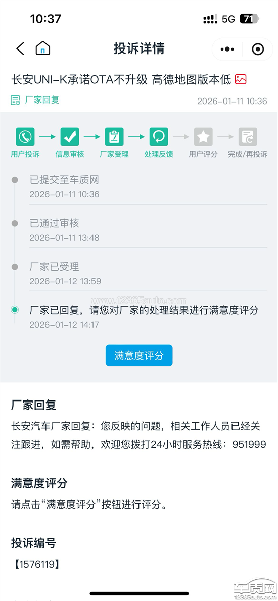 我的车从2022年到现在已有4年,车机系统版本较低且从未更新过。我曾向12315投诉该问题,厂家回应称有4S店人员会联系我,但始终无人联系,仅以“协商不一致”草草了事。此次投诉同样如此,厂家声称有人联系,但截至10月17日仍未有任何反馈,却表示问题已处理。此前的投诉中,厂家仅处理了6次网上投诉,从未通过电话回复车主,对车主的问题置之不理,简直把车主当空气一样对待。