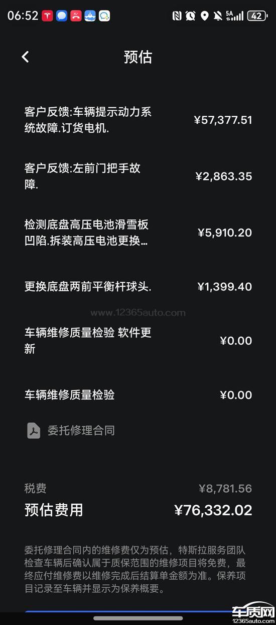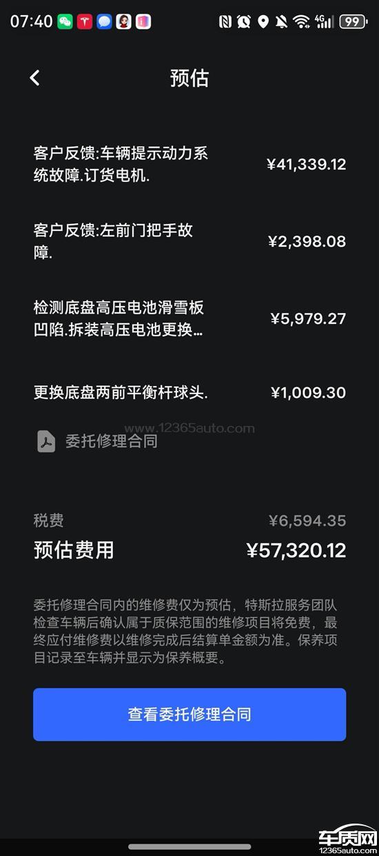 本人是特斯拉十年老车主,车型为特斯拉modelS。2026年1月26号,车辆突然行驶不正常,我将车开至相关服务中心检测,该服务中心经过半天检测后告知我电机损坏,我询问是否可以维修,对方回复只能更换,估价约47000元,同时称还检测到其他五项问题,五项问题维修费用约17000元。车辆未做任何维修,对方收取了我310元检测费,我随后将车开走。1月27号,我致电对方,同意更换电机(费用47000元),并选择维修其他五项中的三项,包括车门把手维修、底盘滑雪板凹陷及底盘平衡杆球头破损,这三项维修报价约11500元,当天我支付了10000元维修定金。2月1号,我将车拖至该服务中心,2月2号早上八点钟,特斯拉APP向我推送了预估总维修费57000元的报价,20分钟后,报价变更为59000元,我同意了该报价,对方承诺2月4号下午修完并开始维修。但当天下午维修过程中,对方又致电告知我,除上述59000元费用外,又发现后桥损坏,需更换,费用约15000元,系统再次推送的总维修报价约76000元。我本不想继续维修,但对方称电机已到货无法退货,我陷入骑虎难下的境地。对方这种诱导式加价行为给我造成了很大困扰,若早告知总维修费需76000元,我绝不会选择维修,最终我被迫同意继续维修。对方承诺2月5号下午5点钟左右交车,我于该时间到达服务中心,发现车辆根本未修好,仍在检测。我在服务中心等待了2个小时,车辆依旧未完成维修,且对方告知我车辆存在方向自动偏左、行驶过程中有异响的问题,我试驾后确认异响较为明显。但对方当时要求我先交完76000元维修费再将车开走,并称次日可再将车开过来检测异响及方向偏左问题。这种不按承诺交车、车辆未修好却逼迫客户交钱的行为极其恶劣,且对方收取300余元检测费后,未提前检测出所有问题,反而在维修过程中多次加价,诱导客户陷入骑虎难下的境地,该行为属于严重的欺骗行为。