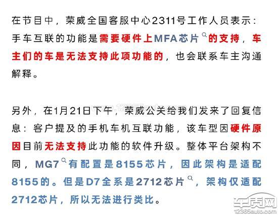 2023款全新三代荣威RX5车主联名诉 求书 致上汽荣威研发部、产品部: 我们是2023款全新三代荣威RX5的车 主群体,现就车辆洛神智能座舱系统的 使用体验,提出以下联名诉求,望贵司 重视并落实 1.核心诉求:尽快推送CarLiFe/HiCar/ICCOACarlink 手车互联功能OTA升级 高通8155芯片具备充足硬件承载能力,手 车互联是广大车主的高频刚需功能,缺 失该功能已成为影响用车体验的主要痛 点,肯请贵司加快与生态方的协议对接 推进功能落地。 2.体验优化:丰富应用生态+提升交互 细节扩充应用商店应用库,开放更多第三方 主流应用; -优化语音识别算法,提升噜杂环境识别 率与复杂指令执行能力; -新增滑移屏“熄火自动归位”功能,简 化常用功能操作层级。 部分功能操作层级过深,行车中操作易分心,希望优化UI逻辑,增设常用功能快捷入口。 3.功能迭代:适配斑马智行元神AI大模 型该大模型已在MG7等车型落地,其智能 交互体验广受好评,希望贵司能尽快完 成三代RX5车型的适配工作,通过OTA 让车主同步享受到前沿技术成果。 4.稳定性提升:修复系统偶发故障 针对低温环境下车机黑屏、功能异常等 问题,希望通过OTA升级优化软件适 配,提升系统运行稳定性。 我们坚信,荣威品牌会重视用户诉求, 通过持续的技术迭代,让洛神智能座舱 的体验迈上新台阶。期待贵司的积极回应!23款全新三代荣威rx5联名车主签名!近期!荣威D7的车主都收到手车互联功能的升级提醒!但全新三代荣威rx5官方就是不明确告知车主!各种途径投诉官方都不回复!D7提醒升级也是所有车主投诉维权赢得的结果。下方是两张截图证明!在节目中,荣威全国客服中心2311号工作人员表示:手车互联的功能是需要硬件上MFA芯片“的支持,车主们的车是无法支持此项功能的,也会联系车主沟通解释。 另外,在1月21日下午,荣威公关给我们发来了回复信息:客户提及的手机车机互联功能,该车型因硬件原因目前无法支持此功能的软件升级。整体平台架构不同,MG7“有配置是8155芯片,因此架构是适配8155的。但是D7全系是2712芯片°,架构仅适配2712芯片,所以无法进行类比。荣威D7OTA升级提醒 尊敬的荣威D7车主,为给您更好的用车体验,荣威将对D7车型进行OTA升级,本次升级包含Carlink和Hicar两大功能。为保证升级后系统稳定、体验流畅,需进行适配性开发及多项测试同时满足工信部备案要求,目前已在加速推动落地,预计最晚于2026年Q3正式推送,敬请期待!