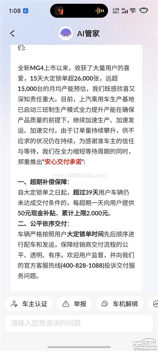 上汽名爵MG4延期交付 承诺补偿未兑现
