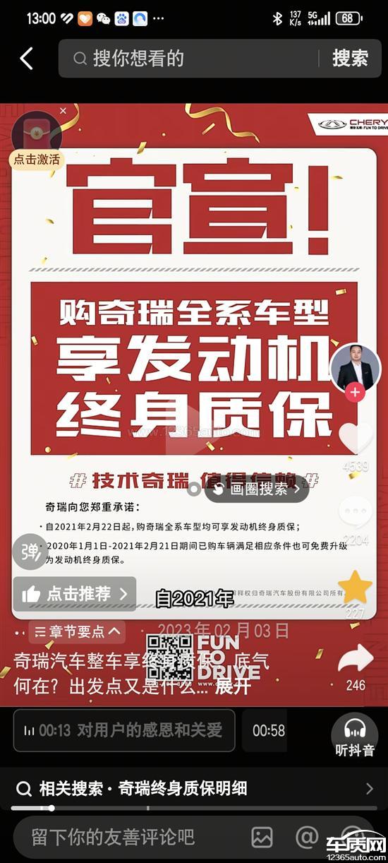 22年年底买的车,首保做完发动机就有失火缺缸,进站多次检查调式都找不到原因,反馈厂家后回馈用户加的油品有问题!(本人两辆车都是加中国石油92汽油。)在后续用车中问题越来越严重,进站检查发动机多缸缸压不足,维保换了发动机缸盖总成。修完当时四个缸压都是8个。现在行驶不到一万公里以上问题又全部出现。反馈厂家后说我的车超出质保期只给跟换气门套件。但是2021年奇瑞就官宣了2021年2月份以后的车发动机是终身质保的。我现在要求跟换发动机机体总成,不接受维修。