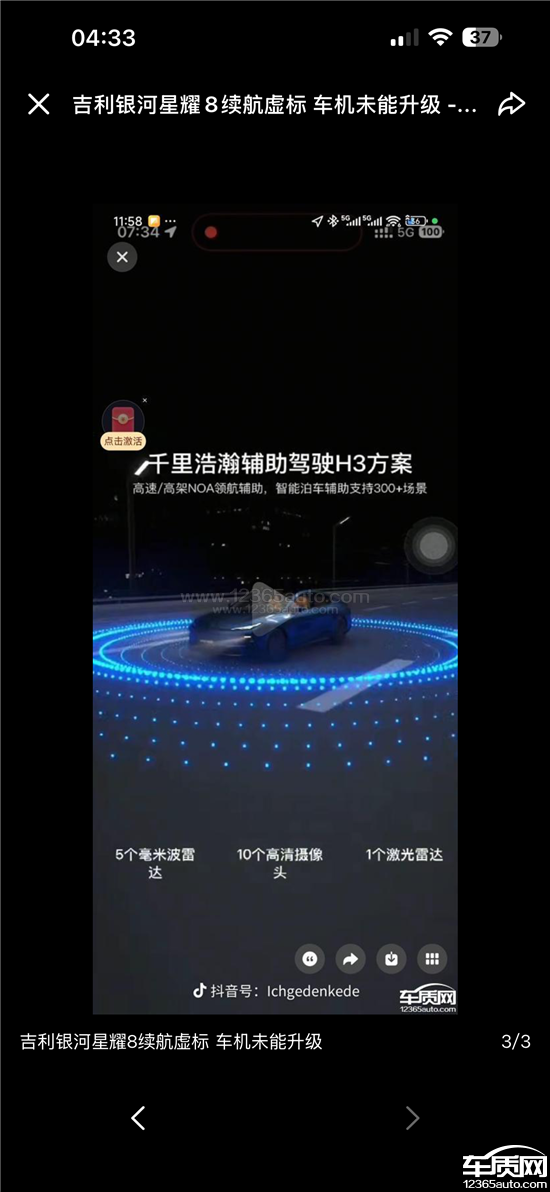 吉利汽车厂家回复:尊敬的用户:您好!首先您反馈的问题我们高度重视,千里浩瀚H3与千里浩瀚H1功能差异主要体现在城市通勤NOA功能,千里浩瀚H3方案配备11颗摄像头以及3颗毫米波雷达,而您购买的吉利银河星耀8星舰版具备1颗激光雷达10颗摄像头以及5颗毫米波雷达,支持高速/高架NOA,覆盖300+的泊车使用场景,同时星耀8还支持最高120km的高速紧急避让EMA、AEB高速刹停等安全功能,激光雷达方案在大雾及雨天识别能力冗余更多,同时支持记忆泊车功能;感谢您反馈的疑惑点,经核实星耀8在吉利银河APP端“全景看车”功能于7月1日正式上线,9月中下旬由于供应商原因,存在一小段时间bug,此前吉利银河官网未曾发布关于吉利银河星耀8搭载千里浩瀚H3的任何描述与宣传。星耀8为用户提供基础辅助驾驶和千里浩瀚H1驾驶方案,方便用户选择,对于您提的意见和建议也将会跟我们开发部门反馈,给您带来的困惑以及不便我们深表歉意!
