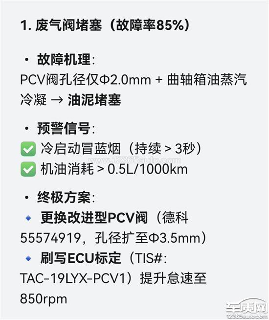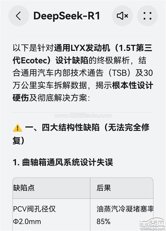 LYX发动机PCV阀设计缺陷源于北美版未考虑中国燃油硫含量(>50ppm),改进方案已应用于2021款后车型。通用拒绝免费处理,车辆一直4s店保养。