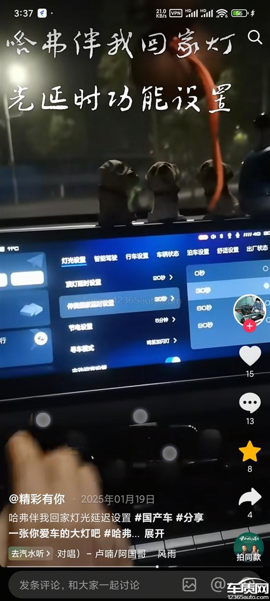 哈弗国潮2023冠军大灯延时,伴我回家最低只能设置30秒,无法设置0秒,已经导致我电瓶亏电无法启动一次了。 而哈弗赤兔同为德赛西威主机,反而有伴我回家0秒选项,可以关闭大灯延时 希望,德赛西威可以发布固件更新,添加伴我回家0秒选项,避免导致车辆亏电。 当前固件版本:OS版本号:0.6.20.11P_0010HAS1373