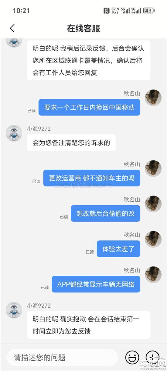 比亚迪在未经用户允许的情况下,自4月初开始大批量擅自更改车机运营商,将车联网卡运营商从中国移动更换为中国联通,导致车辆车机经常显示无网络,严重影响用户用车体验。本人联系官方客服,要求将车联网卡运营商改回中国移动,但截至目前,该问题仍未解决。我的诉求是:要求比亚迪在一个工作日内,将车联网运营商改回中国移动,保障车机网络正常使用,切实维护用户合法权益。