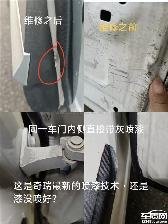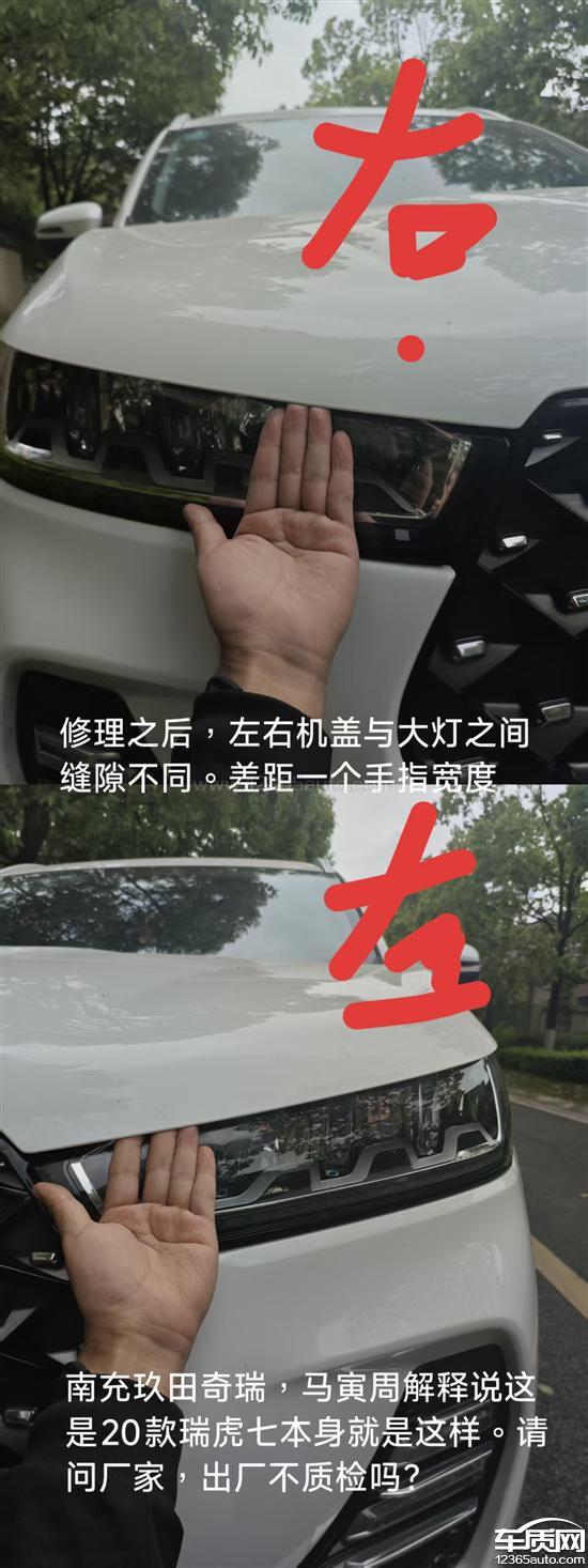 3月16,我车因交通事故受损,南充奇瑞店告诉我他们是申能保险的合作伙伴,叫我把车放在他们服务站维修,当时我右前车门因为撞击打不开,4s店马寅周告诉我,叫我放心回家。他们和定损员蒲亨波会为我定损。从3月16日一直到车辆外观修复之后,一直从未给我定损单据。奇瑞服务站马寅周也从未主动告知我车辆右侧门内受损情况,在修车之前未给我过维修工单及报价单,也从未和我商议过维修方案。严重侵犯我的对车辆受损及维修的知情权,也严重伤害我对奇瑞汽车的信任。在我车辆未修好的时候定损员反复催我签字结案。4s马寅周,也在车门漆未做好,钣金未修复的时候,反复催我去取车,谎称车已经修好。这些严重违规,违法的行为现已造成我车辆翼子板内掉落的残件,不知是车哪个位置的损坏左侧车灯与发动机引擎盖之间缝隙可以伸进一根手指宽而右侧车灯与引擎盖缝隙无法伸入手指。我把残件照片给马寅周看,他说这不是我车的照片,我要求他把残件拿出来核对他说保险公司已经收走,拒不拿出来。我去服务站,他叫人打开翼子板下面挡泥板说你看这里没有。大灯与引擎盖之间的缝隙,他说他们没有修过那里,奇瑞每个出厂的汽车缝隙都不一样。瑞虎7就是那样。对车辆右后门维修,凹陷不但未修复,还把灰一起喷在车门内,导致我车门外观不但没修复还破坏。门槛扒开胶条,可以看见修复钣金时对门槛的损伤找4s店处理问题,他说他认为我的车已经完全修复,有问题叫我找第三方鉴定去。请奇瑞厂家回答,技术奇瑞全球热爱。这种喷漆工艺是不是技术的创新?还是技术的落后与瑕疵