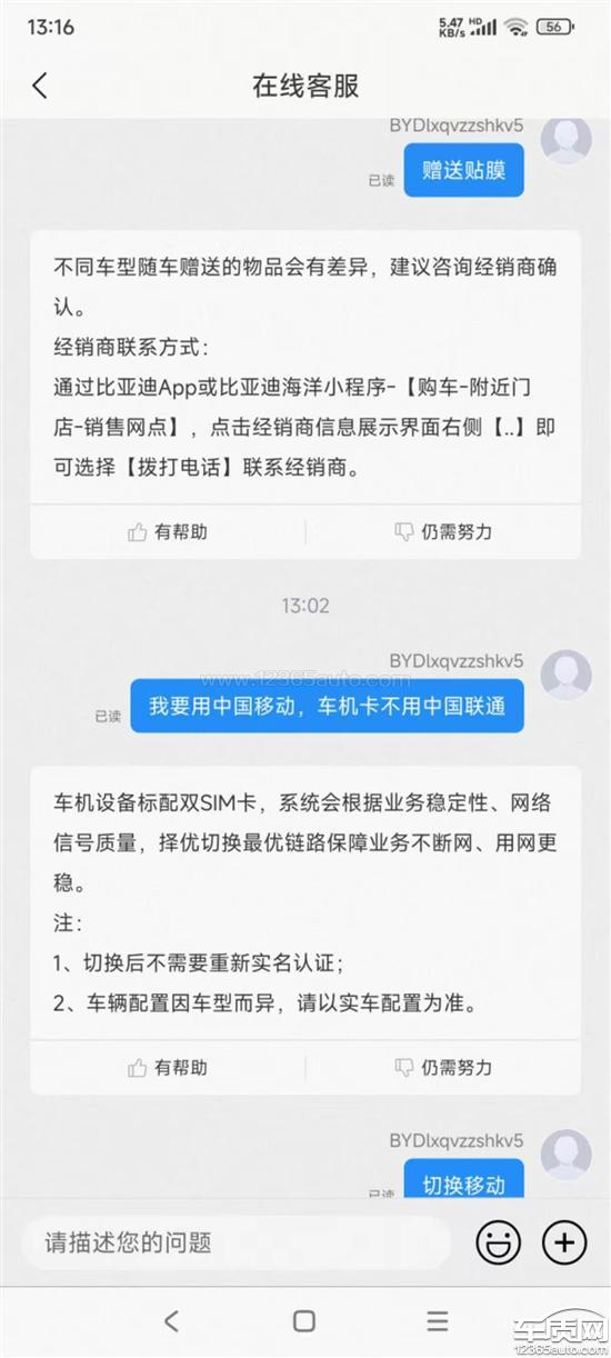 在整个比亚迪宣传官网上都说支持移动联通两种,但是我在和客服要求换移动卡的时候,客服不给我换,打电话4008303666也是回复不给换。但是我这个山区,联通信号覆盖特别不好,车辆随时断网,哪怕我已经放在空旷的地方。既然联通移动都支持,为什么不给我用移动,为什么别人的比亚迪车用移动,我就不给用移动。自动泊车因为偶尔断网泊入不进去,我就没泊入成功过一次,主题商店也打不开,智驾开启中因为临时断网要人工驾驶,在复杂的高速路上,要求人工接管也需要给我反应时间,这真的很困扰。我要求换移动,我不接受联通给我网络排查,我要求换移动,我这里信号覆盖好的只能是移动。比亚迪你们不能耍流氓,我刚买的车。
