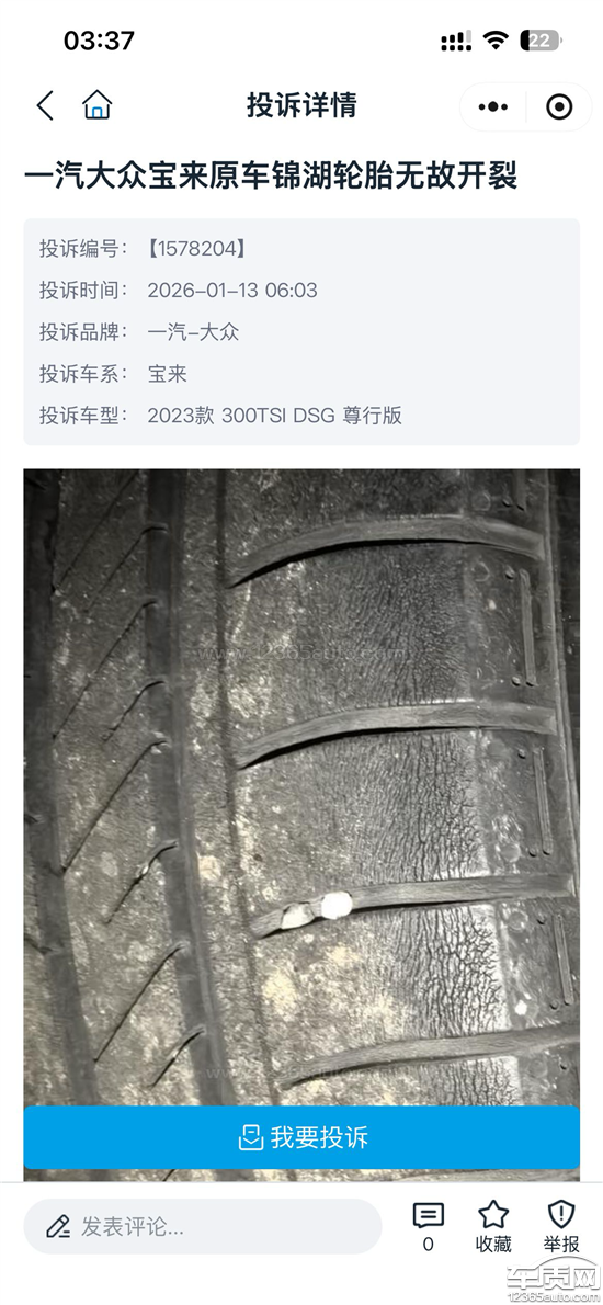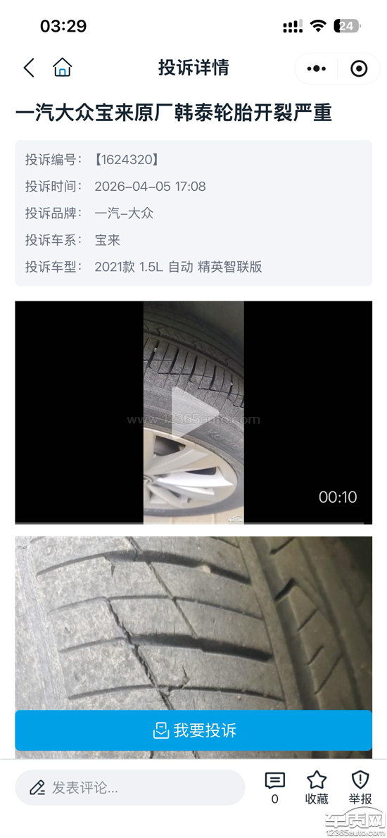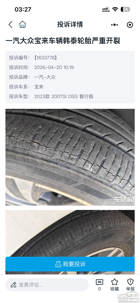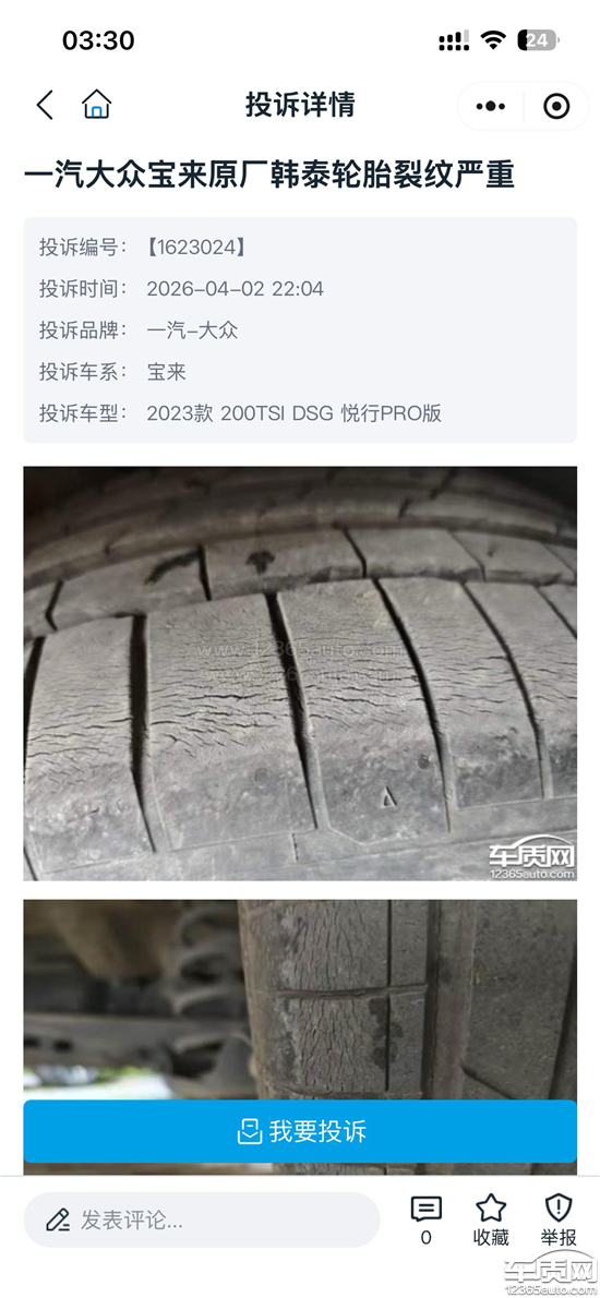 车辆购买后正常家用,保持正常胎压,无暴力驾驶,无鼓包情况,4条轮胎一次都没有补过,目前总行驶里程仅25000多公里,四条原厂配套韩泰轮胎的胎侧,胎面均出现明显裂纹,橡胶存在开裂现象,该情况属于明显质量缺陷,存在高速爆胎的重大安全隐患。大众用韩泰轮胎投诉量这么大为什么不解决问题?轮胎作为车辆核心安全部件仅行驶25000千公里就出现开裂问题,绝非正常老化,属于产品质量不达标。现本人提出如下要求:1,对车辆四条轮胎进行官方质量鉴定,并出具书面鉴定结果;2,针对因质量问题导致的轮胎裂纹,予以免费更换四条轮胎;3,相关厂家及官方售后门店履行安全件质量责任,积极处理问题,不得推卸责任,不的甩锅!